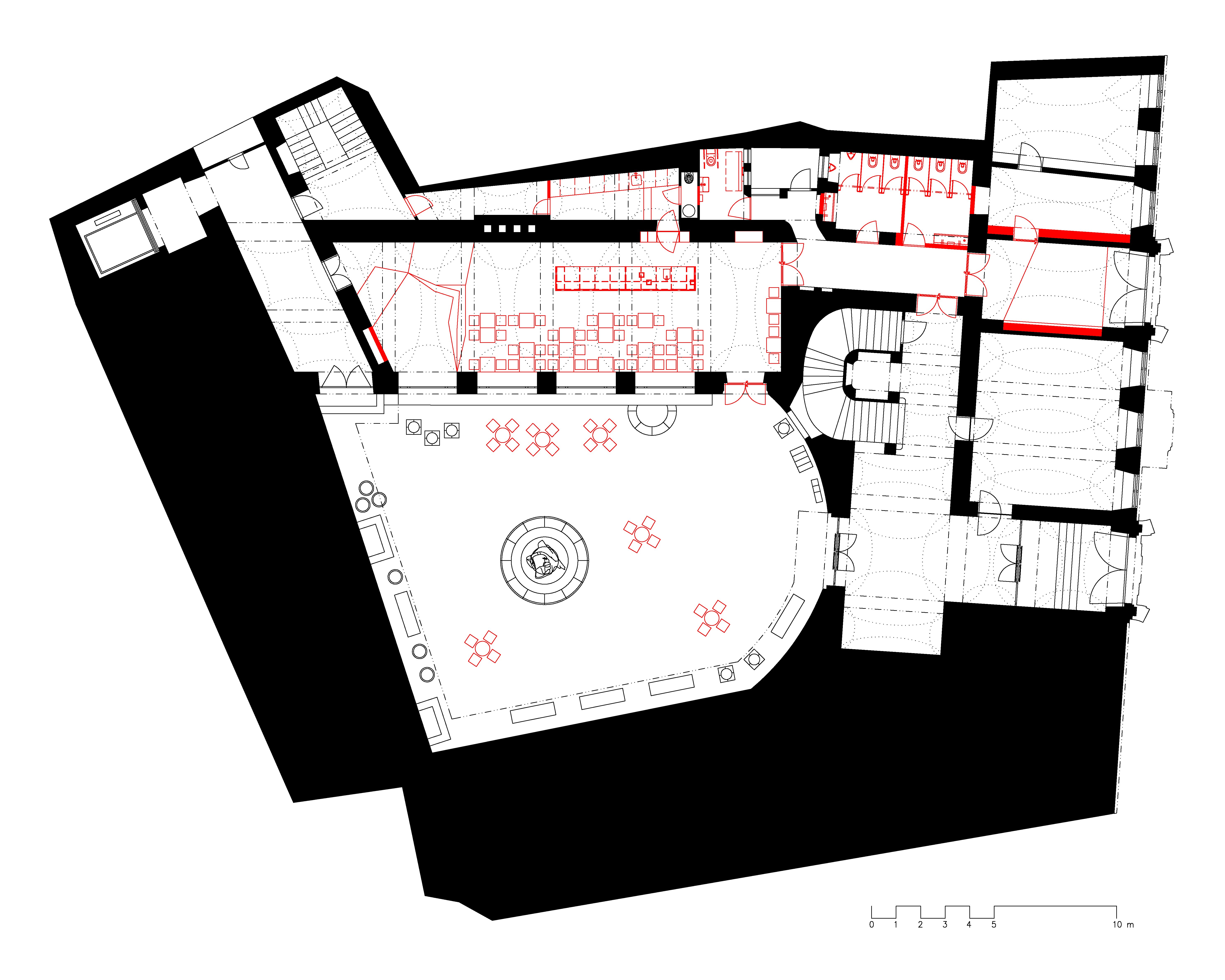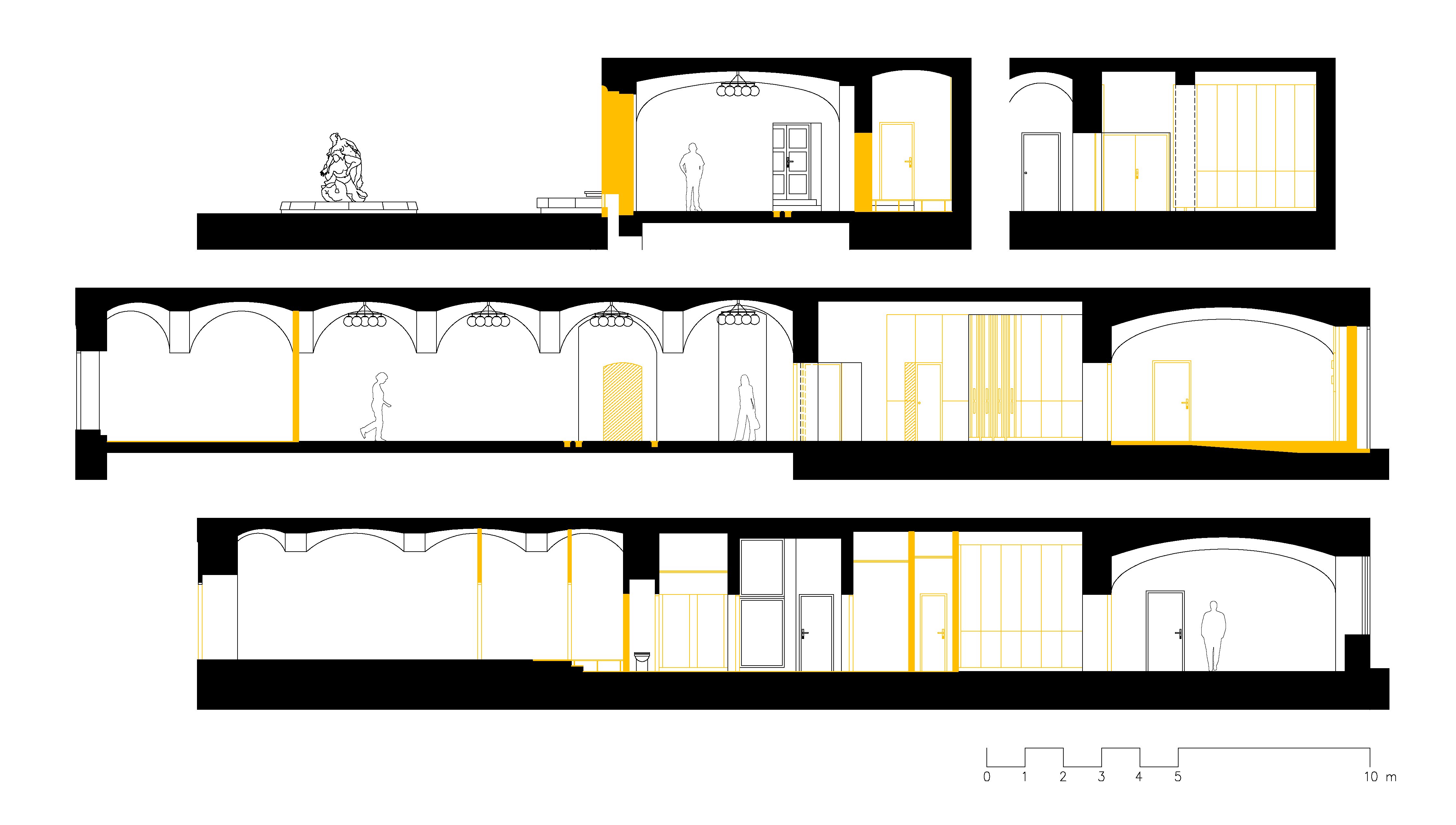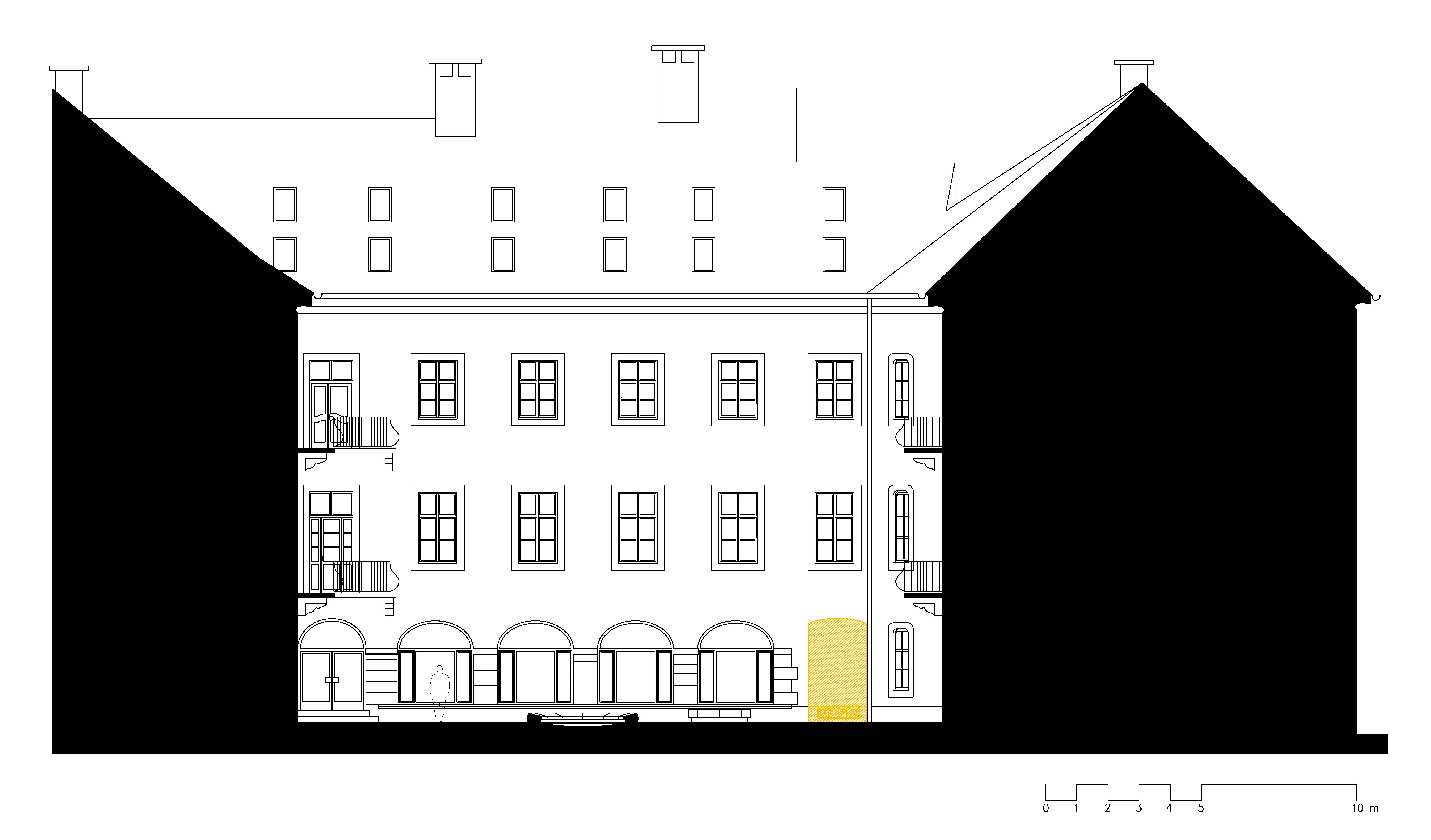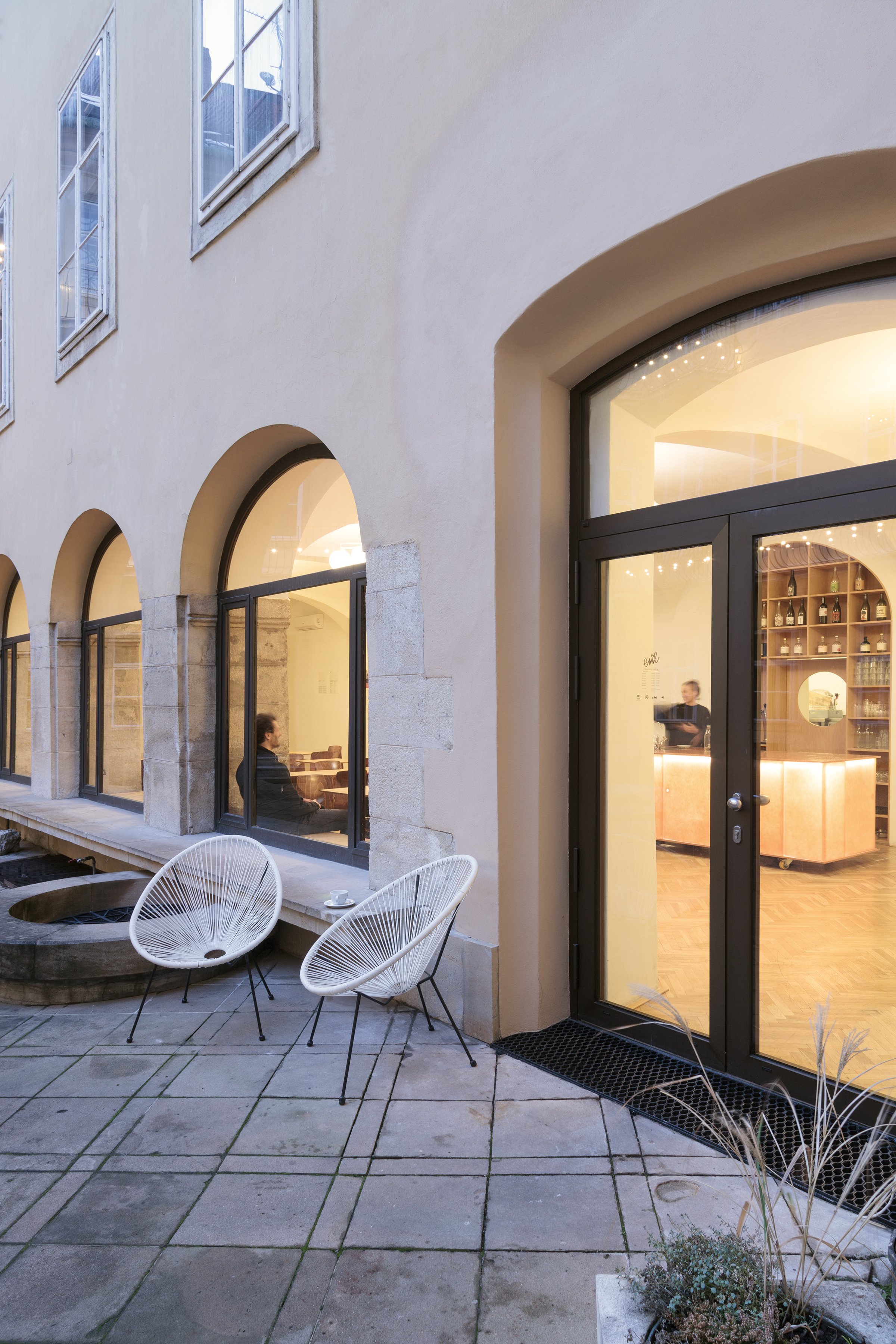 Adaptace části přízemí severního traktu rokokového paláce pro nový kavárenský provoz otevírá galerijní budovu jako bezbariérovou veřejnou kulturní instituci 21. století. Historické vrstvy stavby zůstávají zřejmé díky architektonickému přístupu „doing (almost) nothing“ a materiálové recyklaci. Podélné spojení z ulice zajišťuje obnovená historická brána zpřístupňující kavárnu, wc a výtah. Příčné spojení mezi venkovním nádvořím, hlavním prostorem a zázemím kavárny je skrze obnovené historické otvory se soudobými výplněmi. Otevřenost a mobilita se projevují v záhybech podlahy kavárny, variabilních segmentech baru i navigačních vektorech nových závěsných svítidel.