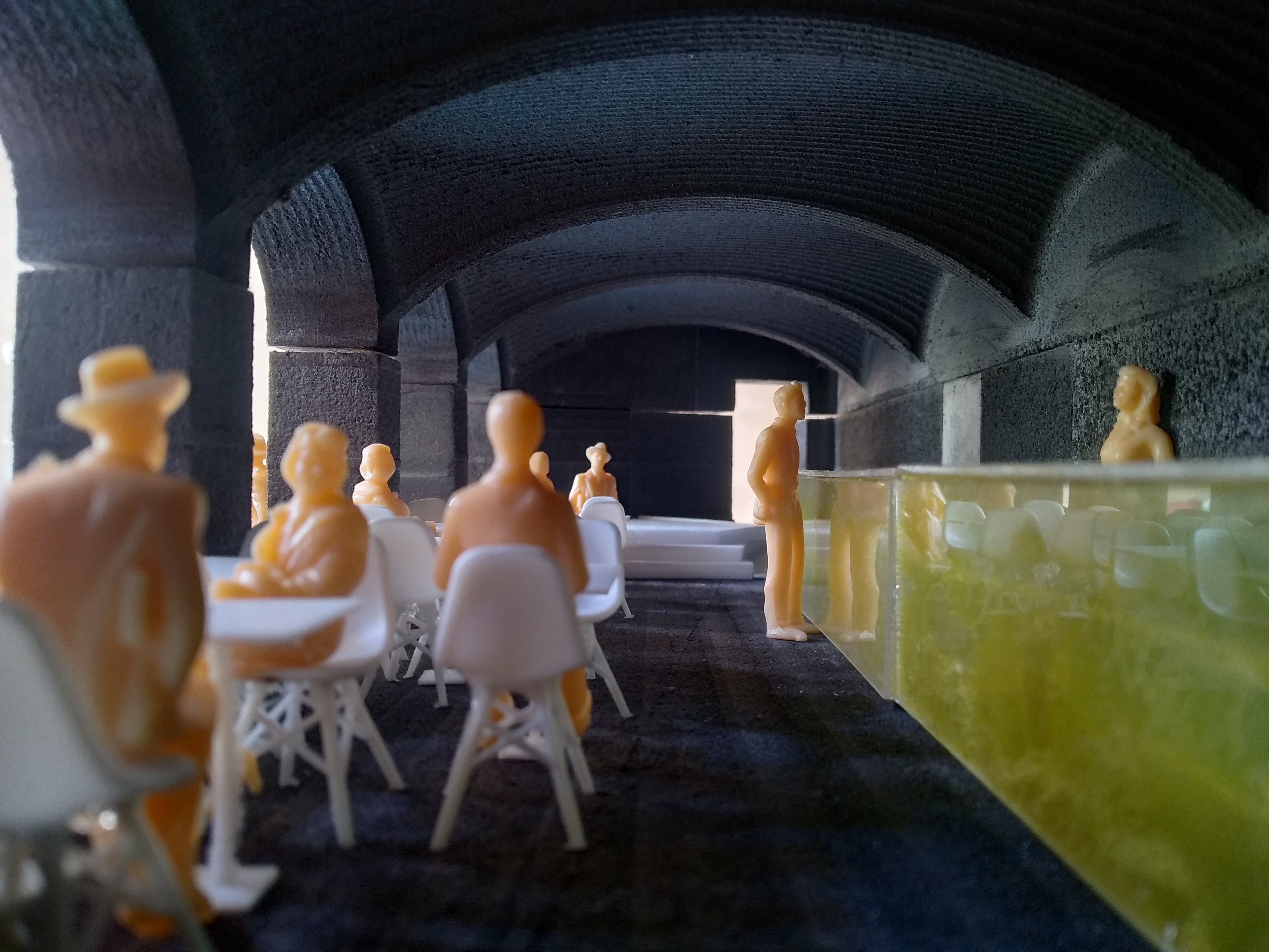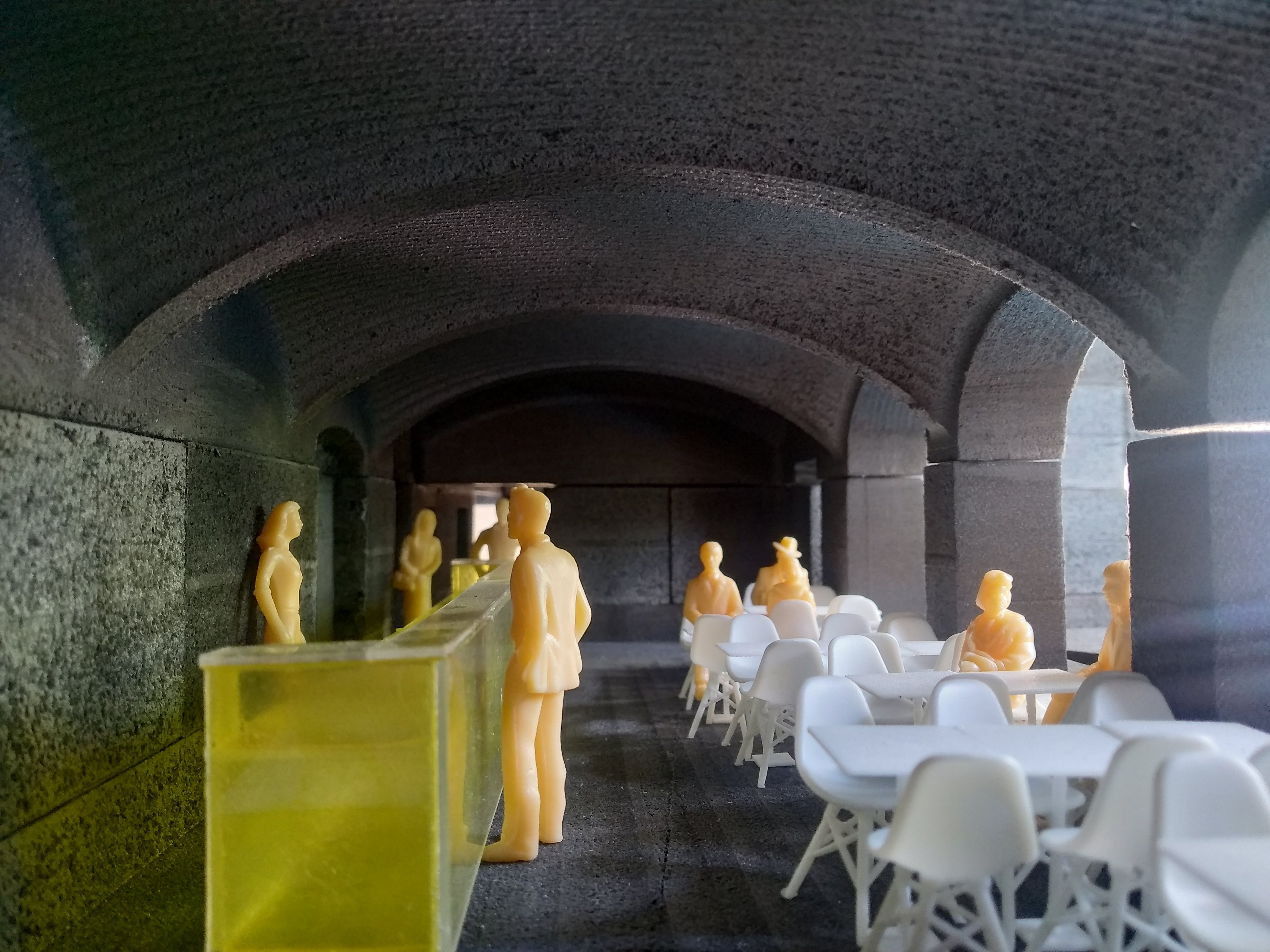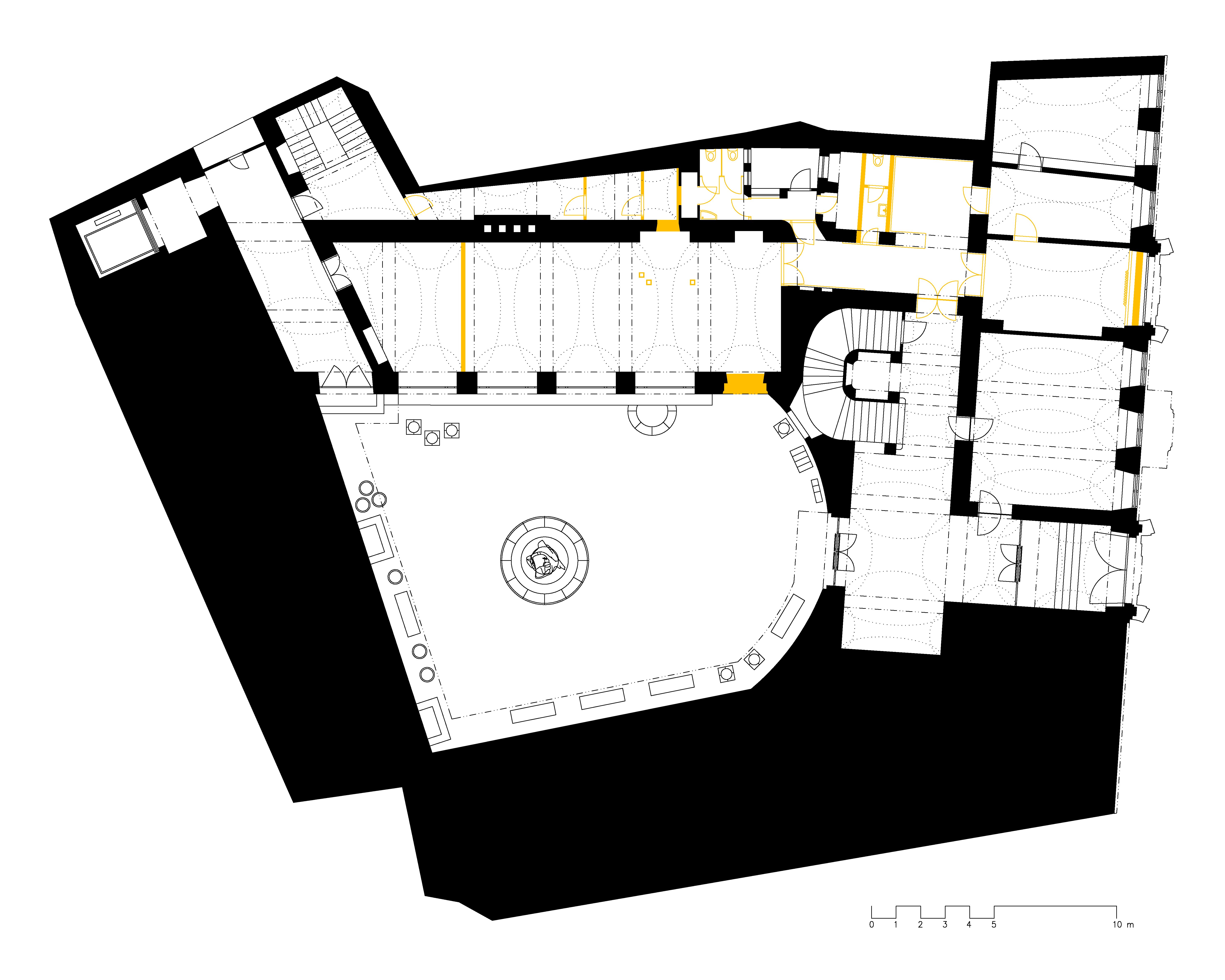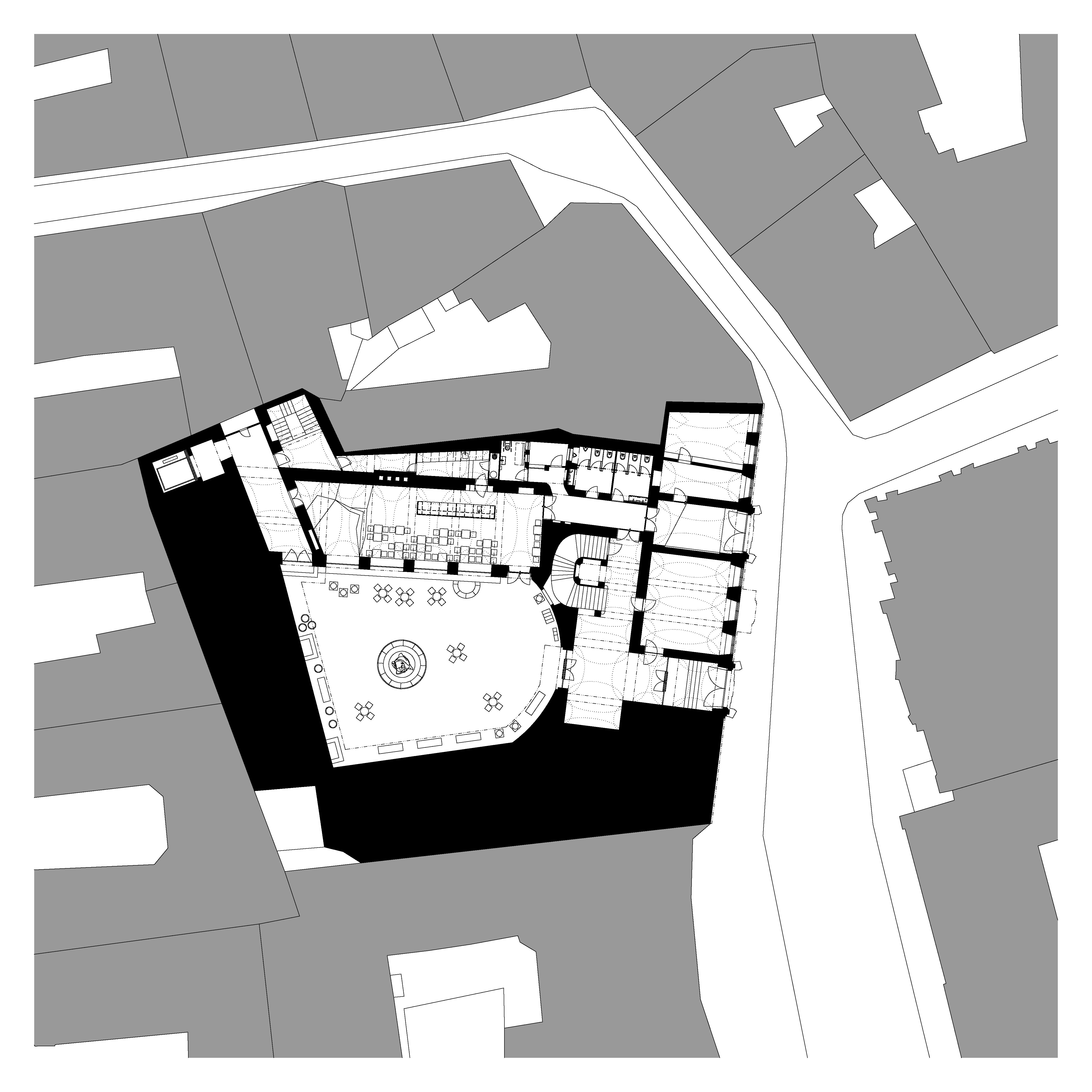 Adaptace části přízemí severního traktu rokokového paláce pro nový kavárenský provoz otevírá galerijní budovu jako bezbariérovou veřejnou kulturní instituci 21. století. Historické vrstvy stavby zůstávají zřejmé díky architektonickému přístupu „doing (almost) nothing“ a materiálové recyklaci. Podélné spojení z ulice zajišťuje obnovená historická brána zpřístupňující kavárnu, wc a výtah. Příčné spojení mezi venkovním nádvořím, hlavním prostorem a zázemím kavárny je skrze obnovené historické otvory se soudobými výplněmi. Otevřenost a mobilita se projevují v záhybech podlahy kavárny, variabilních segmentech baru i navigačních vektorech nových závěsných svítidel.