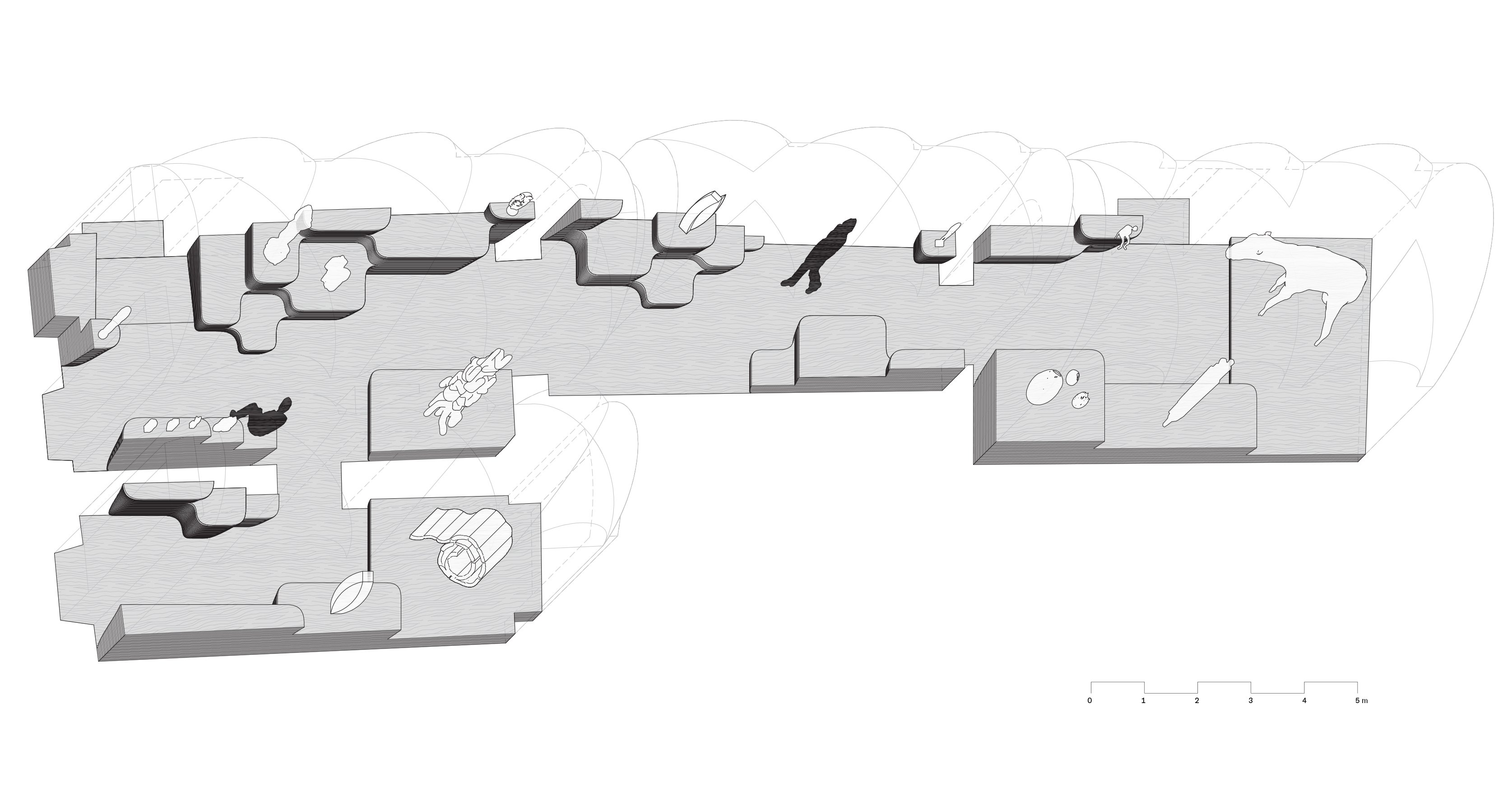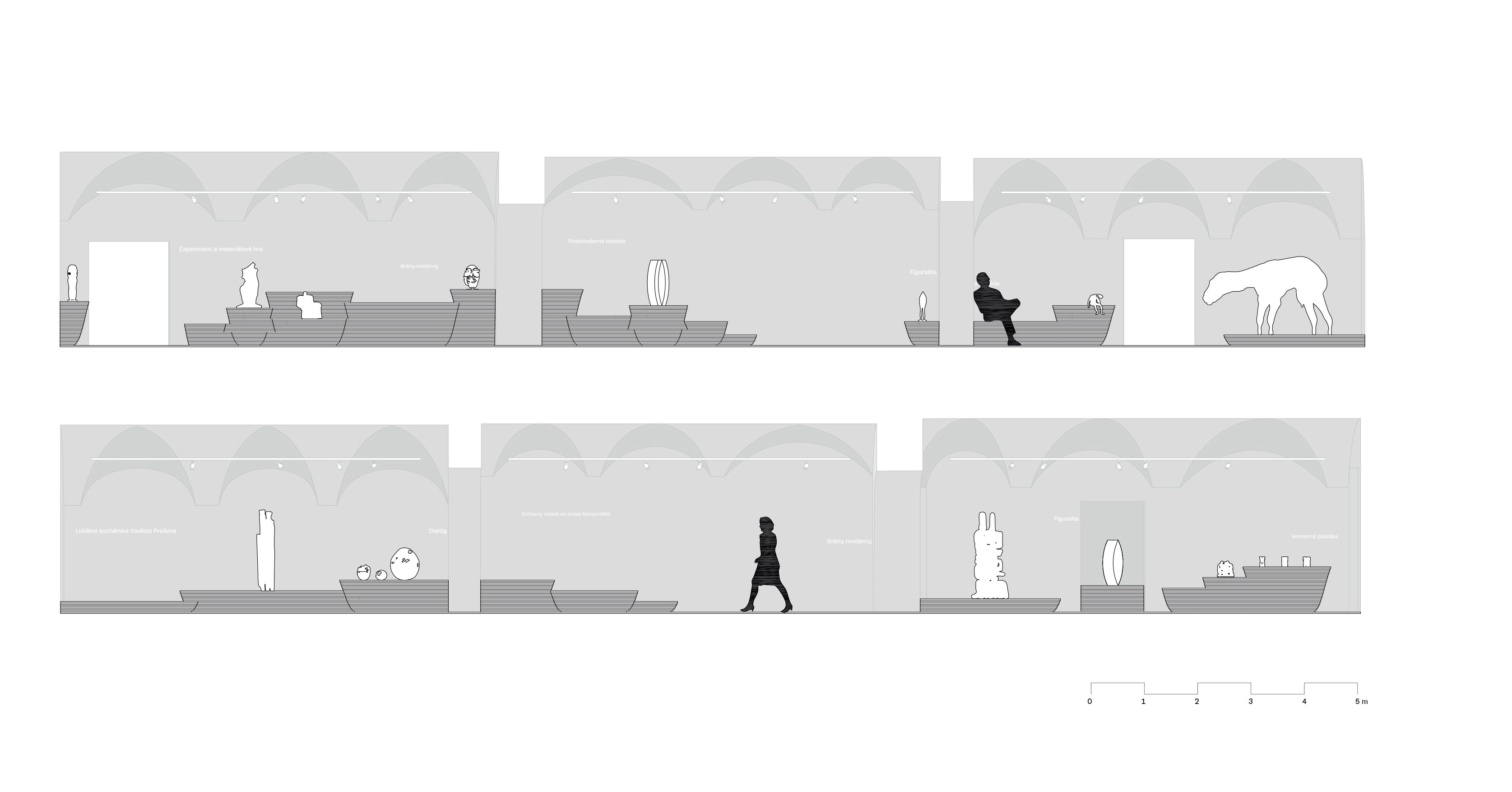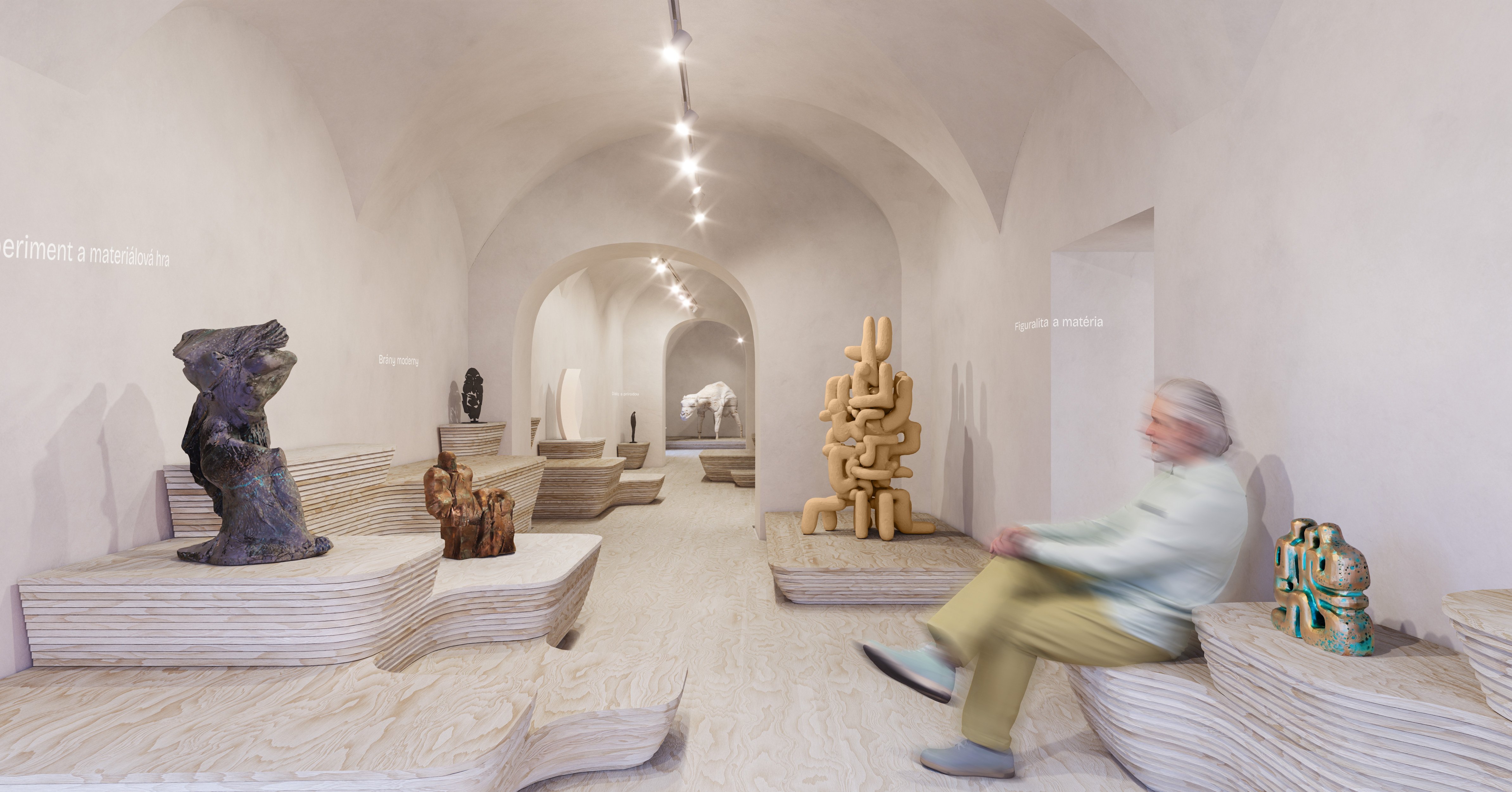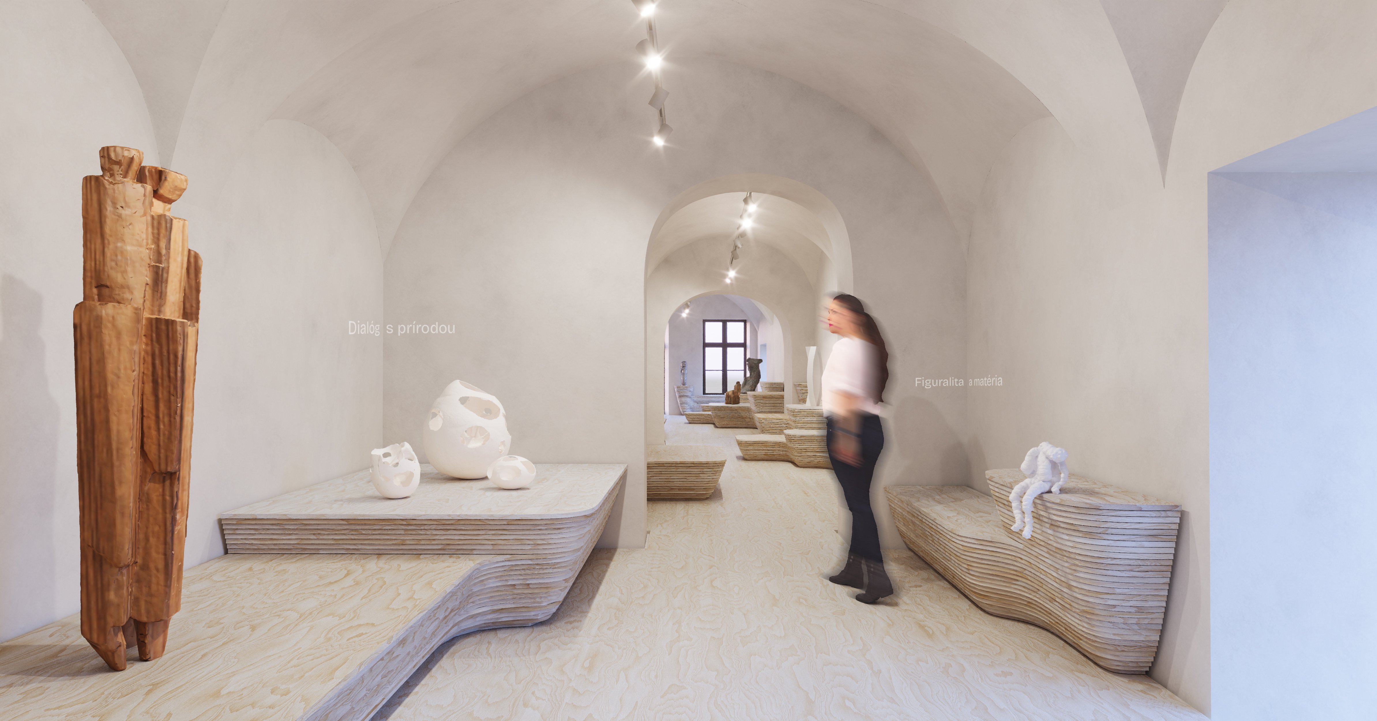 We propose the new permanent exhibition as an immersive environment. The viewer enters it and becomes a part of it just like the exhibited artworks. The immersing principle enables a specific experience of the space and the works themselves. The exhibition environment – the landscape – does not want to compete with the changing artefacts, rather it co-creates specific situations that make them stand out in relationships. The variability of the composition of the exhibition elements is replaced here by the stereotomic diversity of landscape folds and layers. The visitor freely walks through the cultural landscape articulated in this way, discovers art in it, contemplates. In some places the works rest, in others the viewer himself can rest.