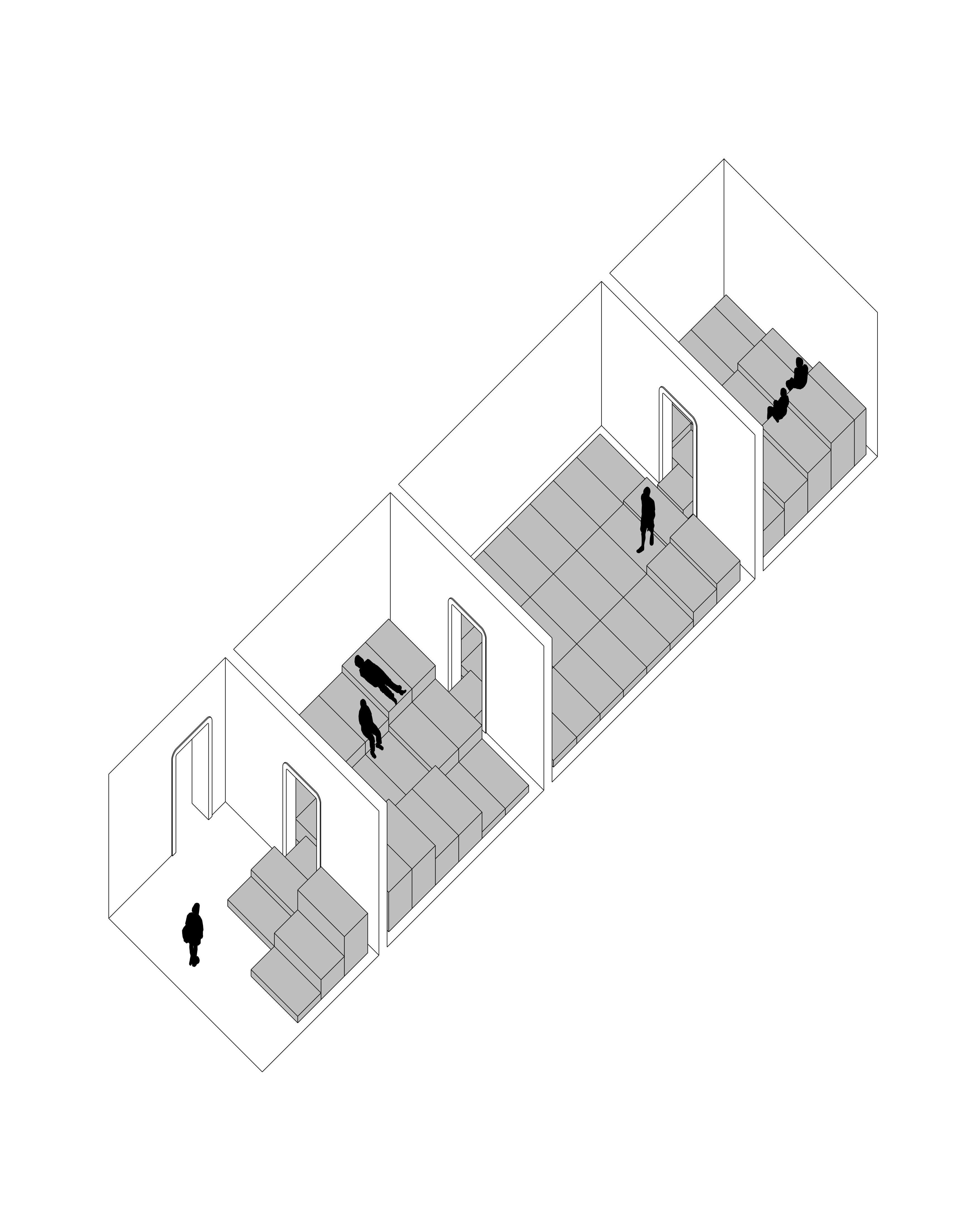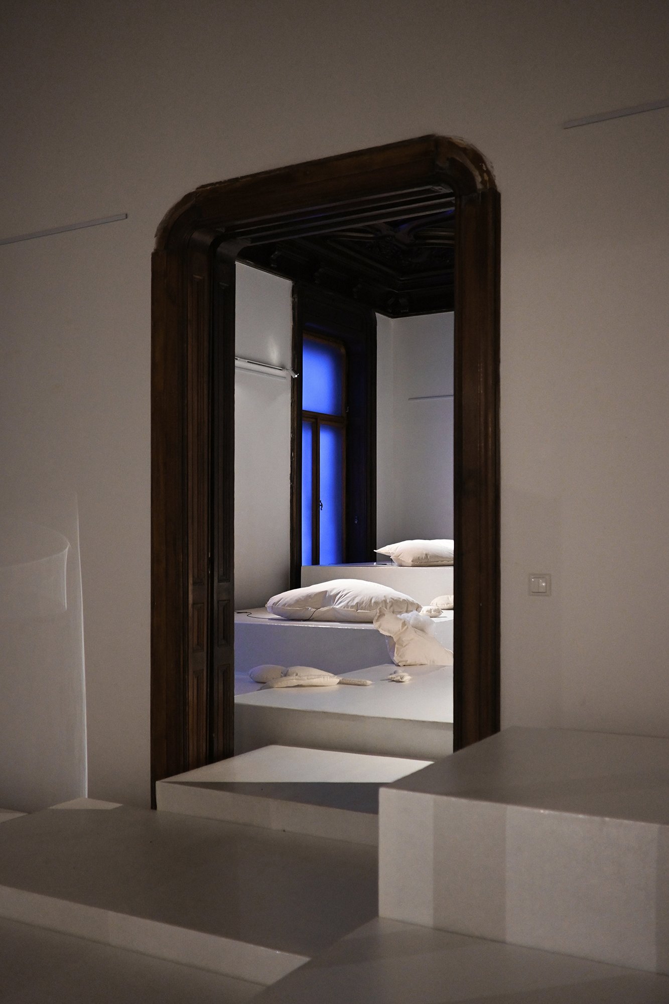 The exhibition of the laureates of the 2024 Oscar Čepan Award on the barrier-free non-accessible floor of the Pistori Palace is an opportunity to exaggerate this problem of many publicly accessible historical buildings in the Old Town of Bratislava. In four exhibition rooms connected by an enfilade, a platform is set up from borrowed, often no longer used stage platforms, which are united by a white exhibition carpet. Together, they create a plinth for placing the artworks of the three exhibitors, which is differentiated by their different requirements and spatial context. This exhibition landscape allows for new experiences of the space, in which the goal is not only to walk through the exhibition, but also to freely reside in it (to sit down, to lay down...).